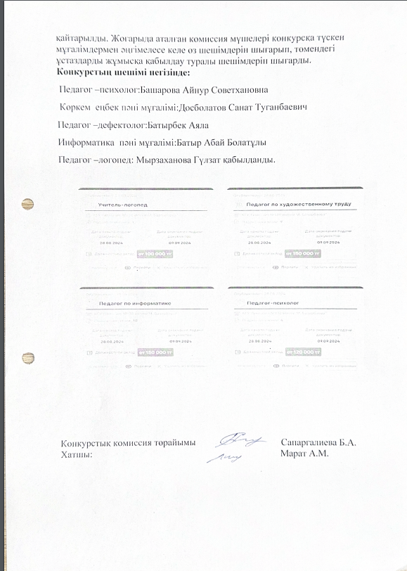 Гимназияның хатшы қызметіне-Кененбай Ұлжан Тойлыбайқызы,педагог-психолог қызметіне Башарова Айнұр Советхановна.Логопед-Мырзаханова Гүлзат.Дефектолог-Батырбек Аяла Алимақынқызы.Технология(ұлдарға)-Туганбаев Санат Досболатович қабылданды.Портфолиолары арнайы мұғалім қабылдлау саәйттары"Enbek.kz" және Nobd арқылы комиссия мүшелерімен бірге тексеріліп,толықтай өтті.
