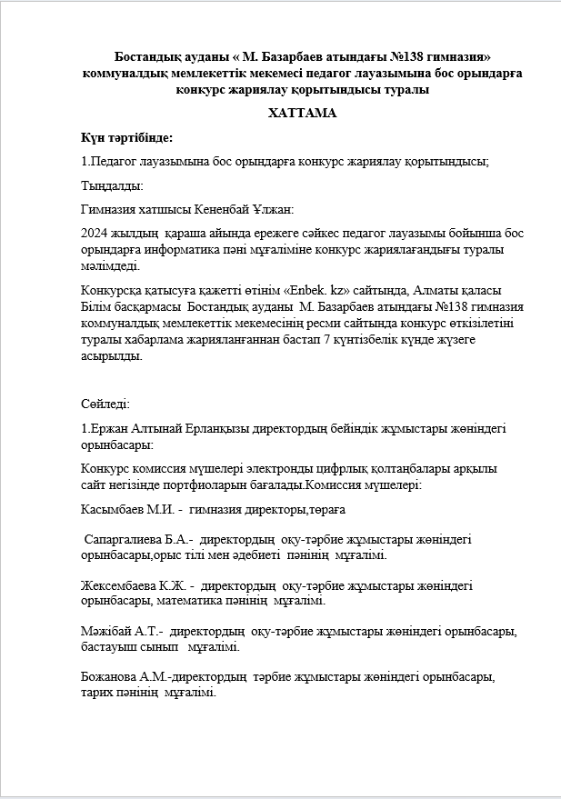 22 ноябрь 2024 0 1 2 3 4 5 Жұмысқа қабылдау.Конкурс нәтижесі Гимназияның информатика пәні мұғалімі қызметіне вакансия нәтижесінде сұраныс жіберген мұғалімдер сұхбаттасуға шақырылды.Комиссия шешімімен информатика пәні мұғалімі қызметіне Ибьраимжан Жанар қабылданды. Осы беттің QR-коды:QR-код этой страницы: