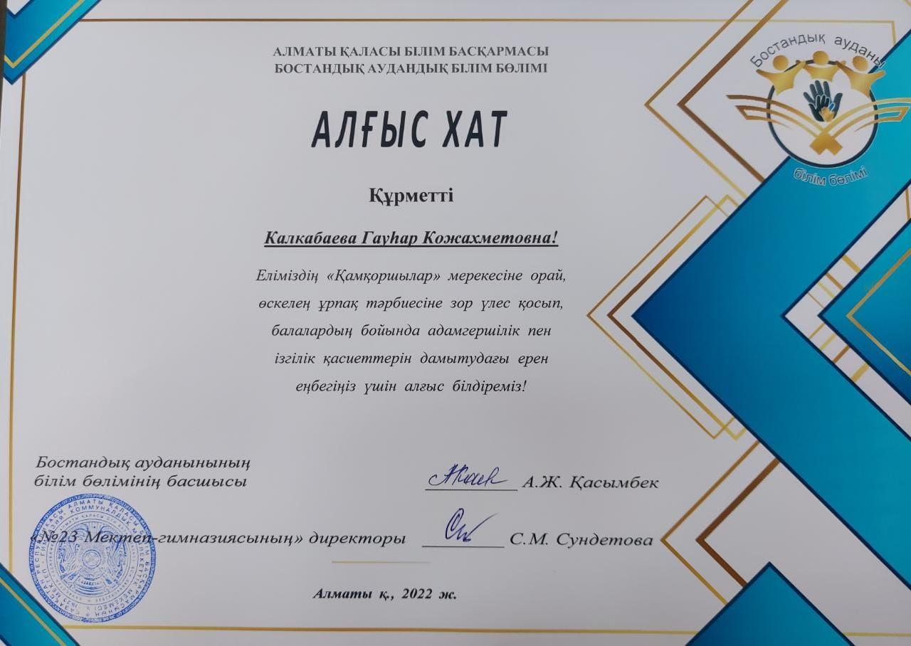 Бостандық ауданы білім бөлімі”Қамқоршылар” мерекесінде қамқоршылардың ерен еңбегіне ризашылығын білдіріп, Алғыс хатпен марапаттады.