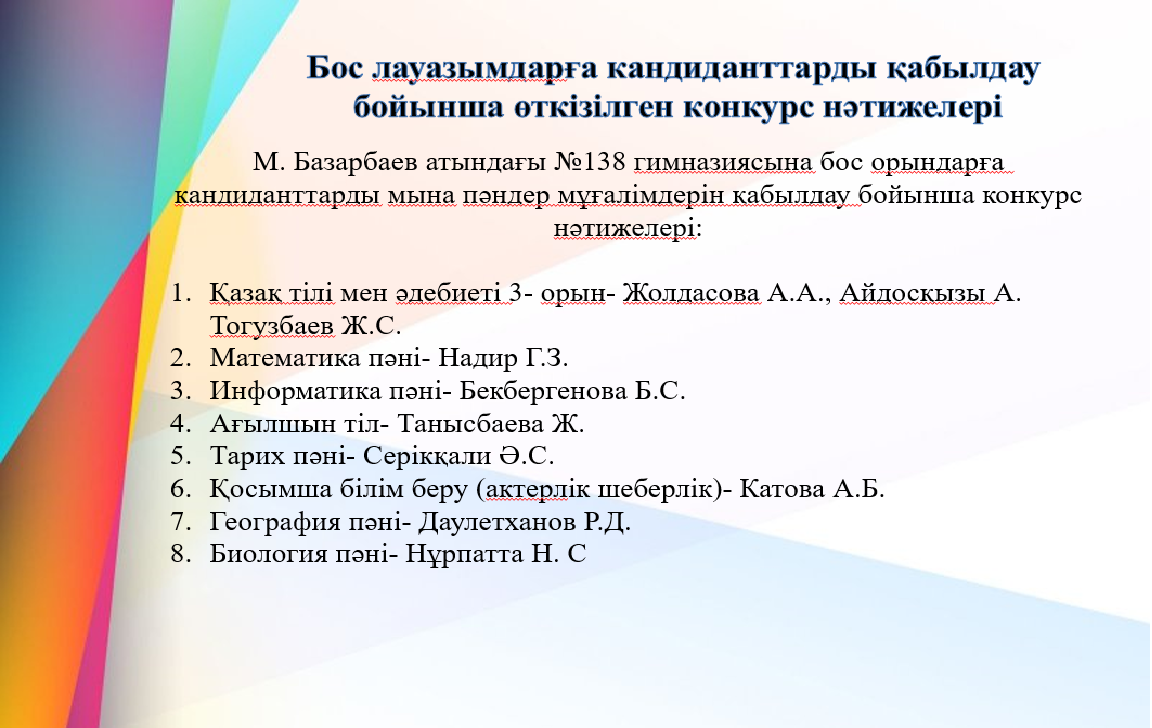 Бос лауазымдарға кандиданттарды қабылдау бойынша өткізілген конкурс нәтижелері