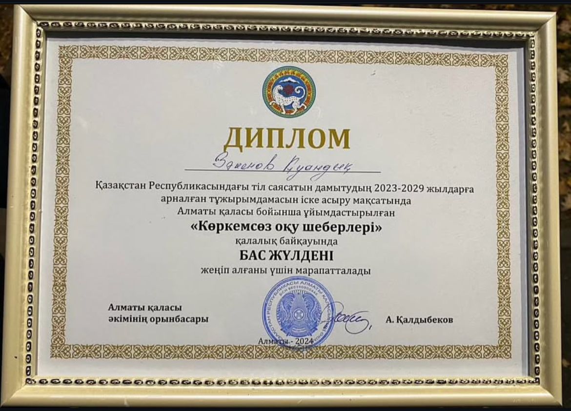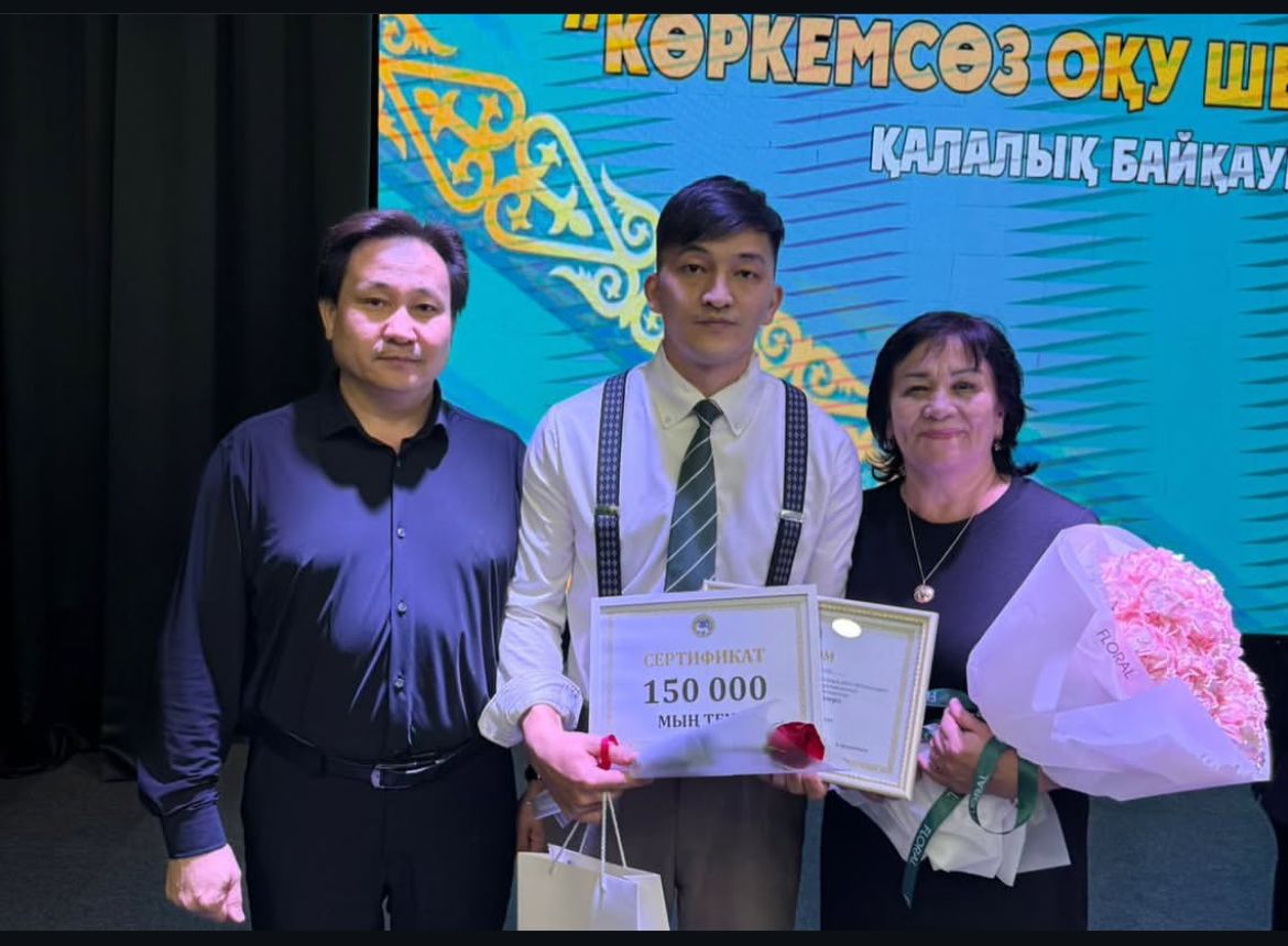 "Көркемсөз оқу шеберлері" сайысында қазақ тілі мен әдебиеті пәні мұғалімі Закенов Қуандық бас жүлде иеленді.